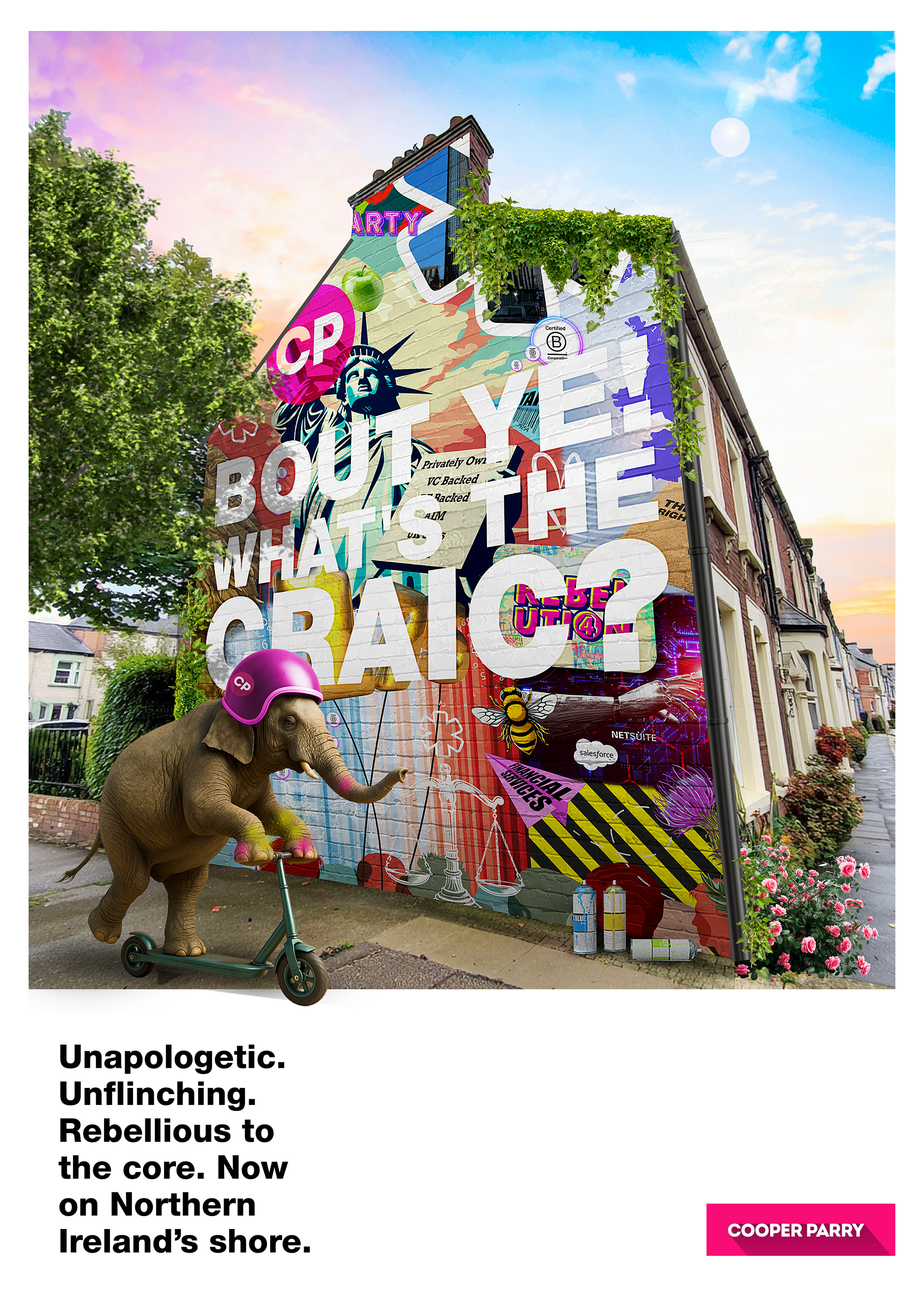 So my first design used the side of a house, leaning into Belfast’s street art culture. My second took over the Causeway Coast with the Game of Thrones castle as backdrop — bold, epic, unforgettable. And because this is CP, I added an elephant on a scooter. Why? Because it’s unexpected, playful, and it shows we don’t just show up — we turn up with personality.
